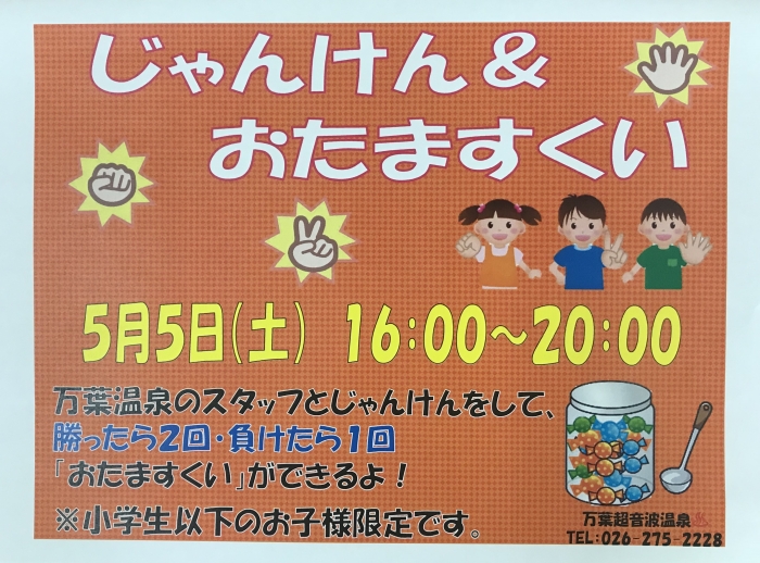 16時から小学生以下のお子様を対象に『じゃんけん&おたますくい』を開催いたします❗️お菓子をたくさんすくっちゃいましょう!ご家族お揃いでのご来場をお待ちしております♨️