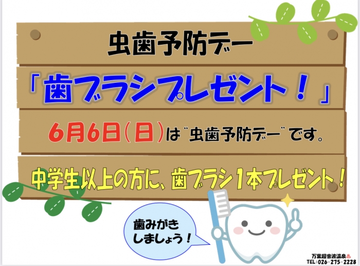 6日(日)は『虫歯予防の日』です!万葉温泉♨️ではお客様に歯ブラシを差し上げます‼️