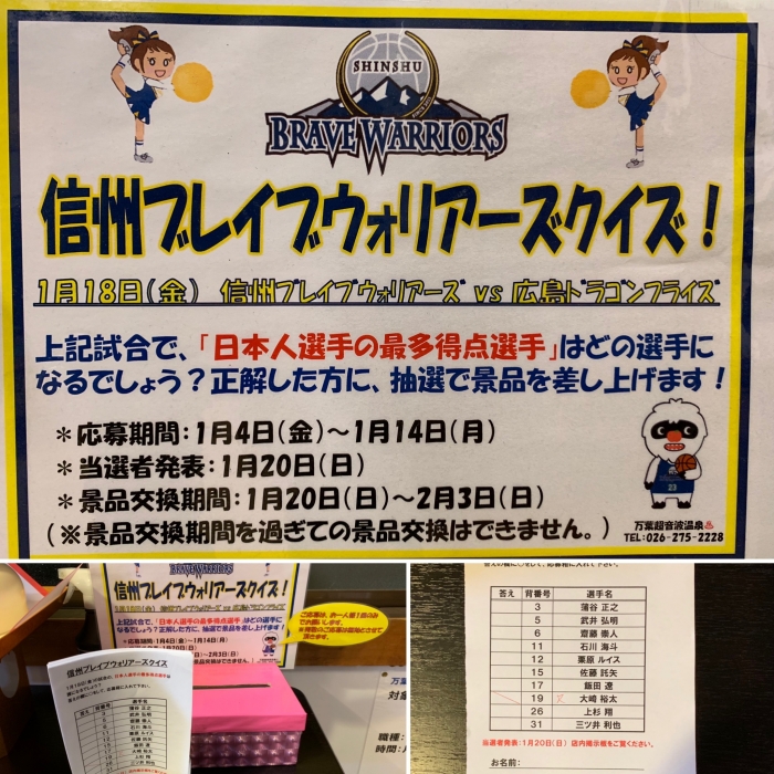 2018-2019シーズン5回目の万葉温泉『信州ブレイブウォリアーズクイズ』を開催しています。 18日(金)のVS広島ドラゴンフライズ戦での『ウォリアーズの日本人選手最多得点選手は?』を当てて下さい正解した方には抽選でウォリアーズ戦のホームゲームチケット他の賞品を差し上げます!申込締切は14日(月)です。是非ご参加ください