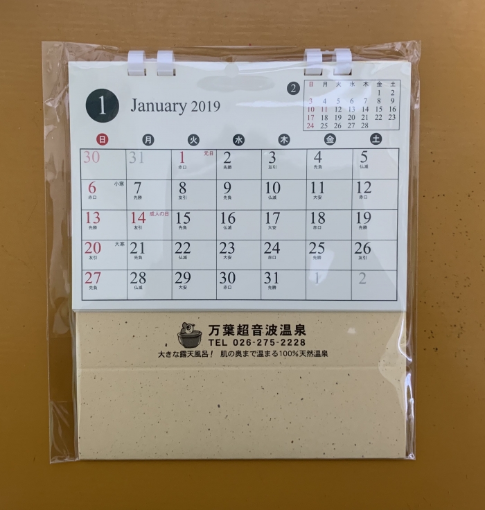 毎度万葉超音波温泉をご利用頂きましてありがとうございます。2018年も残すところ3週間余りになりました。毎年お客様からご好評の『万葉温泉卓上カレンダー』は7日(金)からご来場頂いた先着1000名のお客様にお配りいたします! 大変恐縮ですが、ご家族で一冊とさせて頂きます。なくなり次第終了いたします。