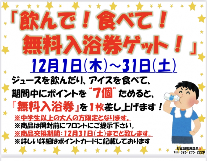 『飲んで!食べて!無料入浴券ゲット!』開催中です‼️万葉超音波温泉ロビーの自販機でジュースやアイスご購入のスタンプを7個ためると「無料入浴券」を1枚差し上げます‼️