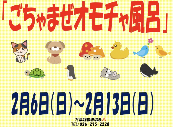 いつも万葉超音波温泉へご来場いただきまして誠にありがとうございます。6日(日)から13日(日)まで"子ども風呂"は『ごちゃまぜオモチャ風呂』開催中です。たくさんのオモチャが浮かんでいます!スタッフ一同皆様のご来場をお待ちしております。