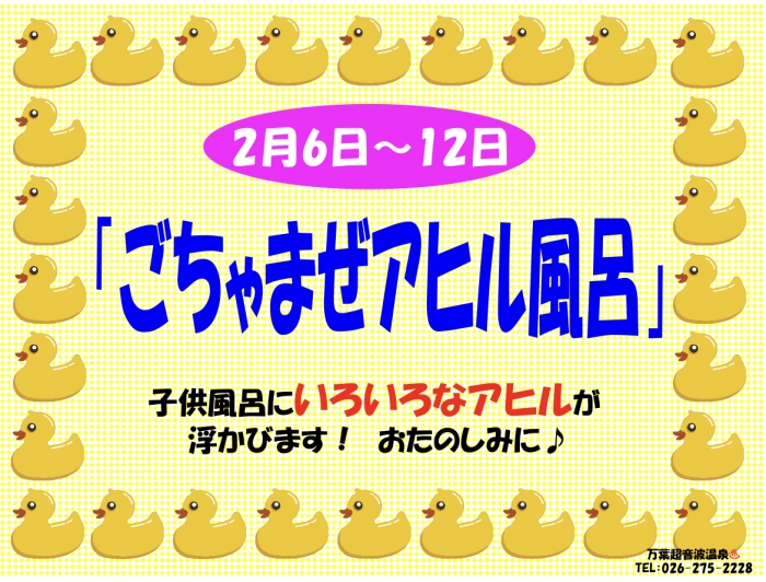 日頃は万葉超音波温泉をご利用いただきまして誠にありがとうございます。2月6日(月)より12日(日)まで『ごちゃまぜアヒル風呂』を開催しています!「子ども風呂」に色々な大きさのアヒルが浮いています!ご来場をお待ちいたします!