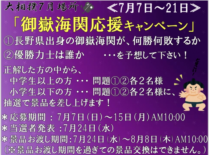 大相撲7月場所が始まりました!長野県上松町出身の東関脇御嶽海関は初日 蒼山のはたきに敗れ残念ながら黒星スタートです。万葉超音波温泉では恒例の『御嶽海関応援キャンペーン』を開催しています。