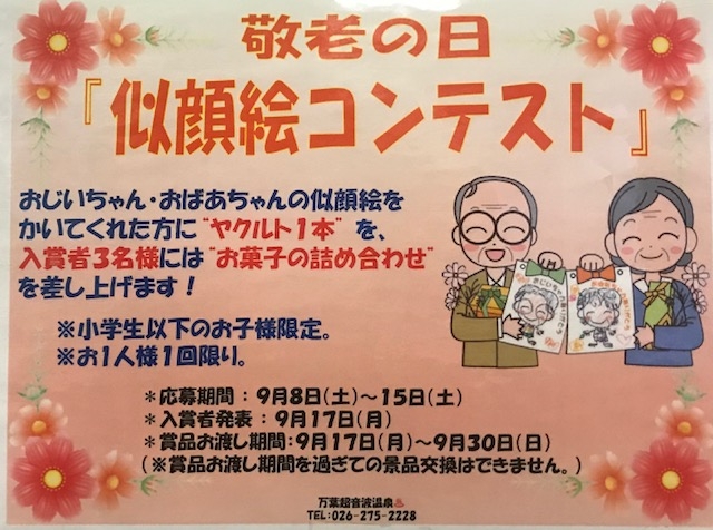 「敬老の日 似顔絵コンテスト」を開催します。8日(土)〜15日(土)におじいちゃん・おばあちゃん の似顔絵をかいてくれた小学生以下のお子様 に もれなくヤクルトをプレゼントします!又、コンテスト入賞した方には「お菓子の詰め合わせ」を差し上げます! 詳細は万葉温泉フロントまで。