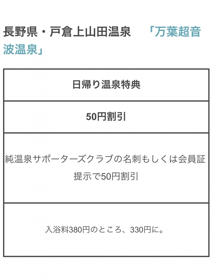 『純温泉サポーターズクラブ会員』の方はクラブの名刺又は会員証ご提示で50円割引きでご入浴できます。(会員様ご本人に限ります)