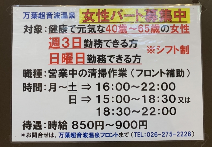 「万葉超音波温泉♨️女性パート募集中」です。下記の通り『フロント補助係』を募集しています。詳細は万葉温泉フロントまでお願い致します。☎️026-275-2228