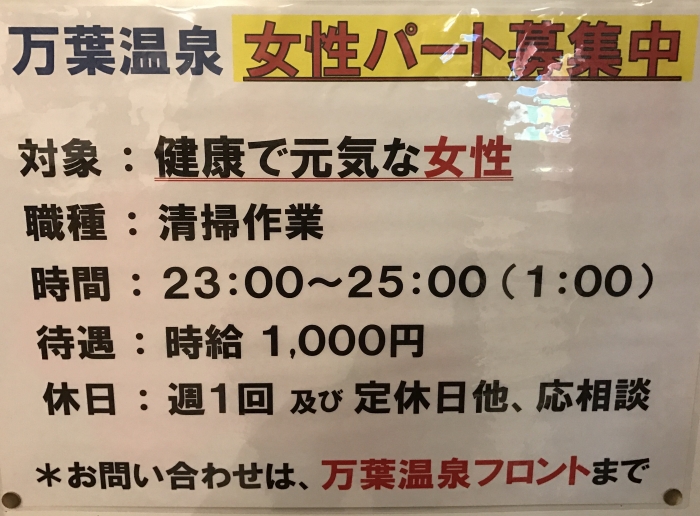 万葉超音波温泉では営業終了後の浴槽清掃等のパートさんを募集しています。詳細は 026-275-2228 万葉温泉フロントまでお願いいたします。