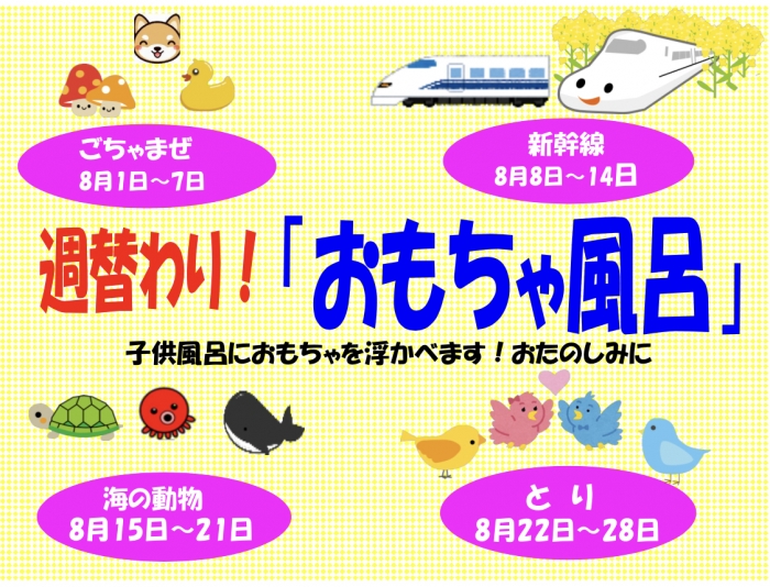 8月の万葉超音波温泉♨️では『週替わり❗️おもちゃ風呂‼️』を開催中です❣️ 8日(日)〜14日(土)は大人気の「新幹線おもちゃ風呂」です‼️