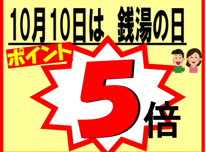 10月10日(木)は恒例の『銭湯の日』です♪万葉超音波温泉は「ポイント5倍デー」です‼️お誘い合わせてのご来場をお待ちしております‼️