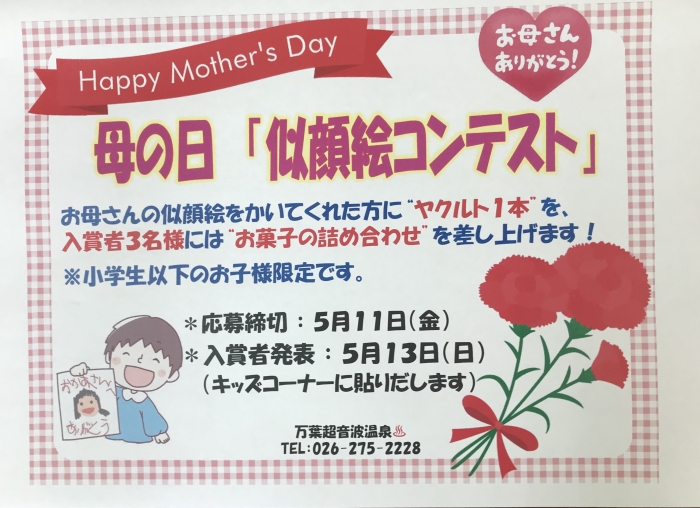 万葉超音波温泉♨️母の日イベント『お母さんの似顔絵コンテスト』に沢山のご応募ありがとうございます‼︎ 11日まで開催しています。ご参加下さい!対象は小学生以下のお子様です、13日母の日に入賞者の発表を行います‼︎