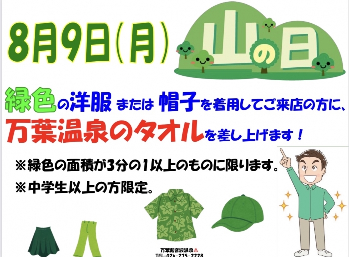 9日(月)は『山の日』の振替休日です❗️万葉超音波温泉♨️では緑色の洋服や緑色の帽子でご来館のお客様に当館の緑色のオリジナルタオルを差し上げます‼️