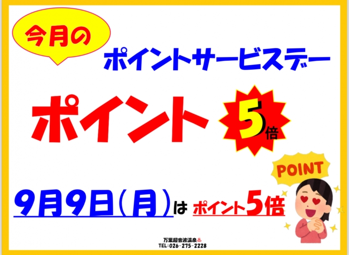 9月9日(月)の万葉超音波温泉♨️は『ポイント5倍デー』でお客様をお迎えしています‼️お誘い合わせてのご来場をお待ちしております‼️