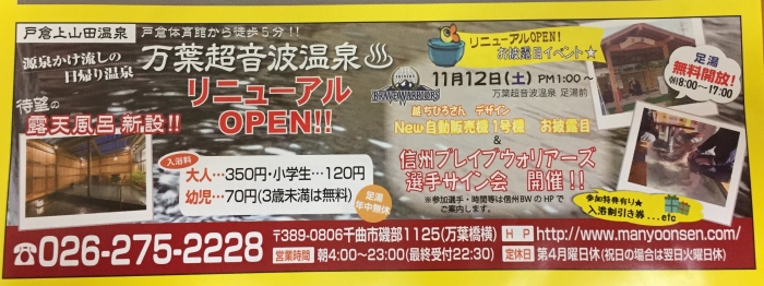 11月12日(土)午後1時から万葉温泉足湯♨️で信州ブレイブウォリアーズ選手によるサイン会&トークショーの開催が決定しました! 参加特典として万葉超音波温泉の入浴割引券を差し上げます。#6斎藤崇人選手、#24鈴木大選手が参加予定です。