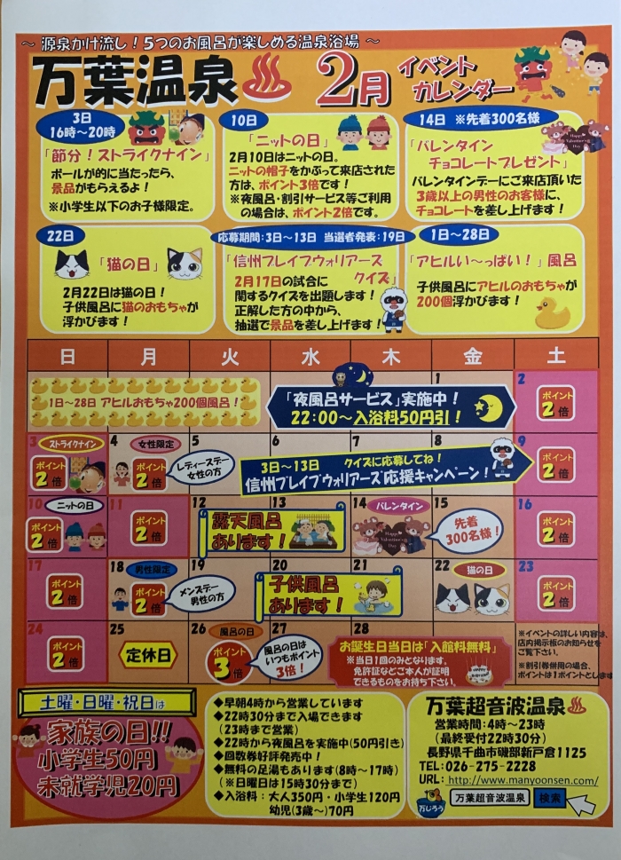 毎度万葉超音波温泉をご利用いただきまして誠にありがとうございます。2月のイベントカレンダーです!2月もお得なポイント倍増デーやお楽しみイベントでお客様をお迎えいたします。"ひとっ風呂350円"源泉かけ流し天然温泉・5つの浴槽でお客様のお越しをお待ちしております!